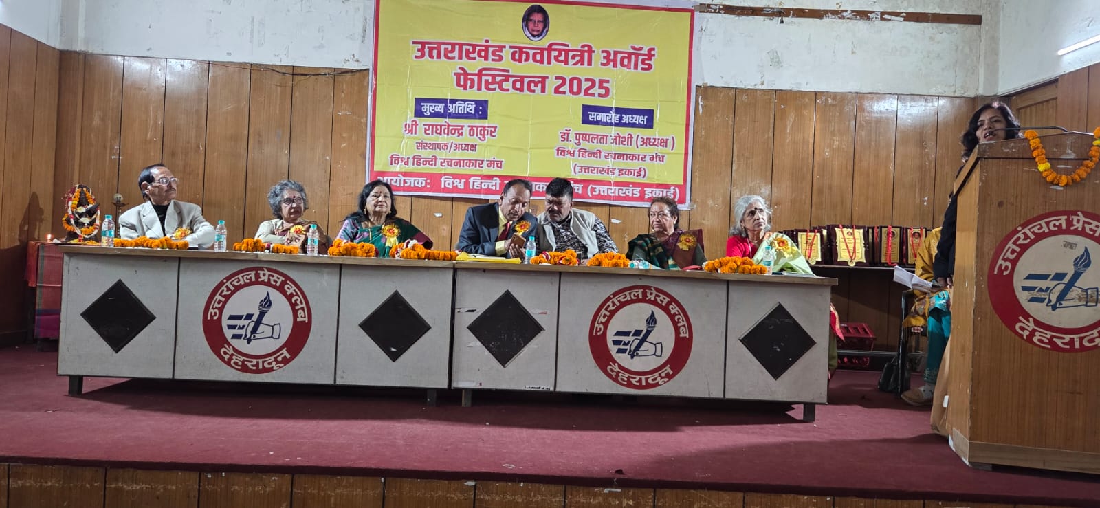 उत्तराखंड कवित्री अवार्ड फेस्टिवल 2025 का आयोजन रविवार को उत्तरांचल प्रेस क्लब के सभागार में आयोजित किया गया। समारोह का शुभारंभ मंच के संस्थापक एवं समारोह के मुख्य अतिथि श्री राघवेन्द्र ठाकुर द्वारा माँ शारदे की ज्योति प्रज्ज्वलित कर हुआ। इस अवसर पर सरस्वती वंदना कवयित्री डॉ वन्दना खण्डूरी द्वारा प्रस्तुत की गई।