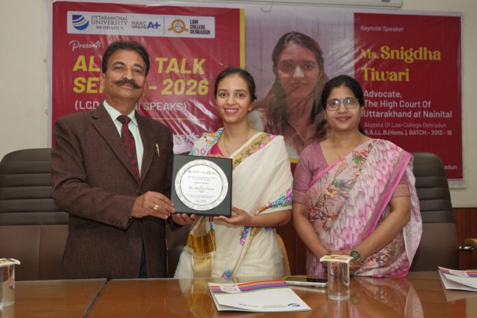 उत्तरांचल विश्वविद्यालय के लॉ कॉलेज, देहरादून में आज कॉलेज की पूर्व छात्रा एवं नैनीताल हाईकोर्ट की अधिवक्ता स्निग्धा तिवारी को एलुमनाई टॉक सीरीज़ 2026 में मुख्य वक्ता के रूप में आमंत्रित किया गया।