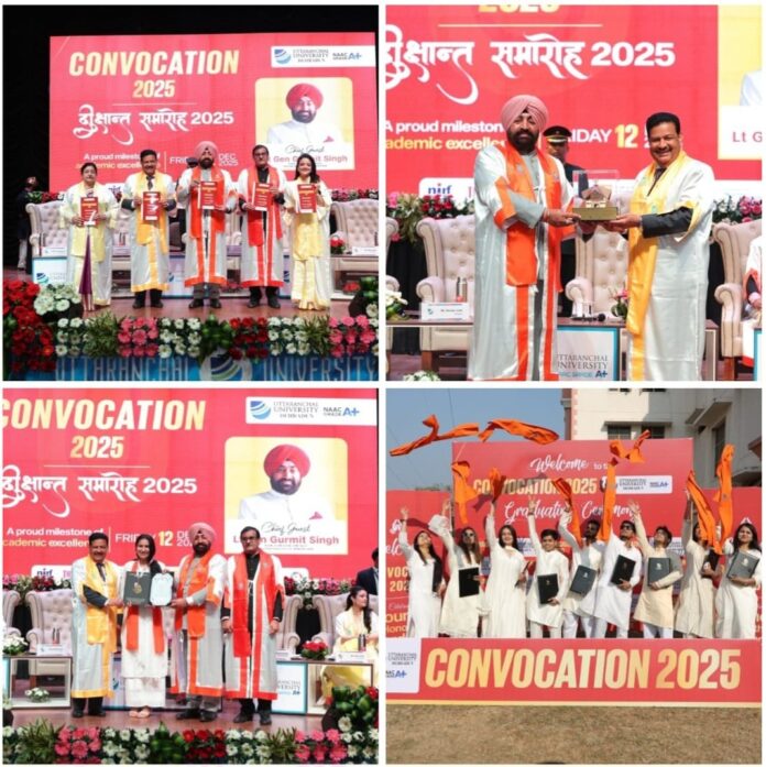 देहरादून । उत्तरांचल विश्वविद्यालय में आज विश्वविद्यालय के छठें दिक्षांत समारोह का भव्य आयोजन किया गया। प्रदेश के महामहिम राज्यपाल लेफ्टिनेंट जनरल गुरमीत सिंह (से0नि0) इस अवसर पर बतौर मुख्य अतिथि उपस्थित थे। समारोह में 52 छात्रों को गोल्डमेडल, 35 को पी0एच0डी, 85 को पी0जी0 व 2239 को यूजी की डिग्रियों से नवाजा गया। विश्वविद्यालय आगमन पर महामहिम राज्यपाल ने शौर्य दीवार पर परमवीर चक्र विजेताओं की तस्वीरों पर पुष्पांजलि दी। विश्वविद्यालय के एन0सी0सी0 केडेट द्वारा महामहिम को गार्ड ऑफ ऑनर देकर स्वागत किया गया।