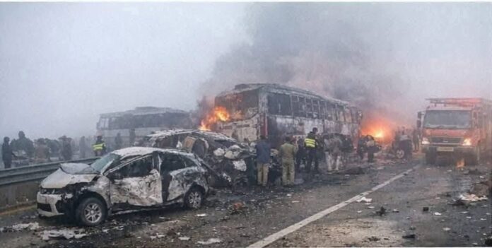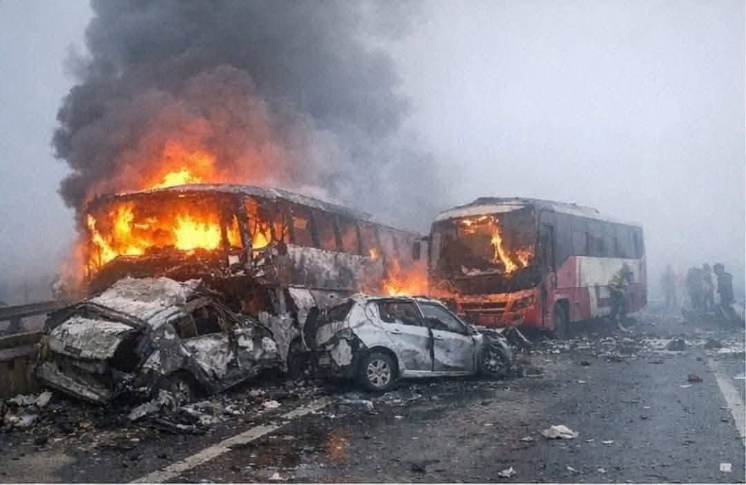 यमुना एक्सप्रेसवे पर घने कोहरे के कारण 7 बसें और तीन कारें आपस में टकराई, 13 की मौत 100 से अधिक घायल, कई वाहनों में लगी आग